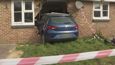 Officers along with fire and ambulance crews are at the scene of the crash at The Fox and Hounds pub in Fox Hill Haywards Heath. The car ended up in the living room of the house. Police said the driver told them she suffered a medical episode before the crash.